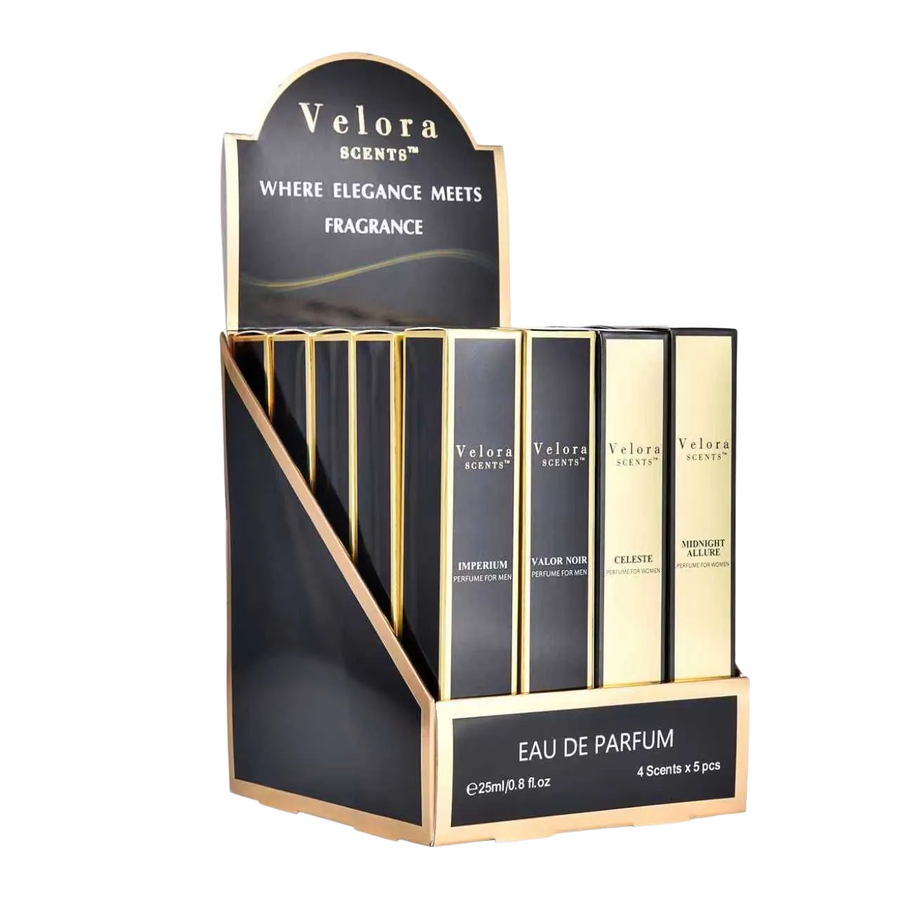 Velora Scents was born from a desire to make luxury feel personal, not distant. Each fragrance in our collection is crafted to evoke elegance, confidence, and identity. Inside every Velora Scents box, you’ll find four luxurious eau de parfum sprays, each 25ml (0.8 fl oz), perfectly sized for daily wear or travel. Designed with intention and passion, these perfumes speak to both power and softness , a balance of strength and allure.